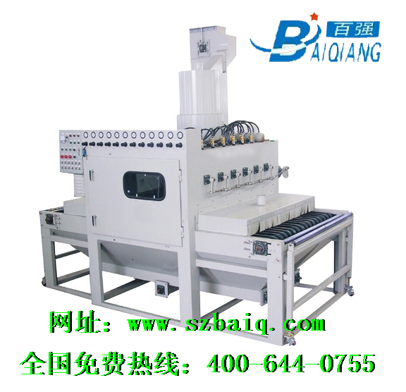 2. 可將工件置于工作盤上,調(diào)整噴槍之距離及搖擺幅度,啟動(dòng)輸送帶后即可自動(dòng)噴砂作業(yè) 3. 噴槍可依客戶需要由8-12支組,極為適合量大而固定工工件之快速加工 4. 此機(jī)型尺寸可依客戶需求另行訂制 適用:玻璃、石材、電木、手工具、鋁合金、不銹鋼、一般鐵板、鋁擠型等制品 5.本機(jī)型可放工件最大寬度為1.2米 整機(jī)尺寸 3380L*1600W*3000H mm |